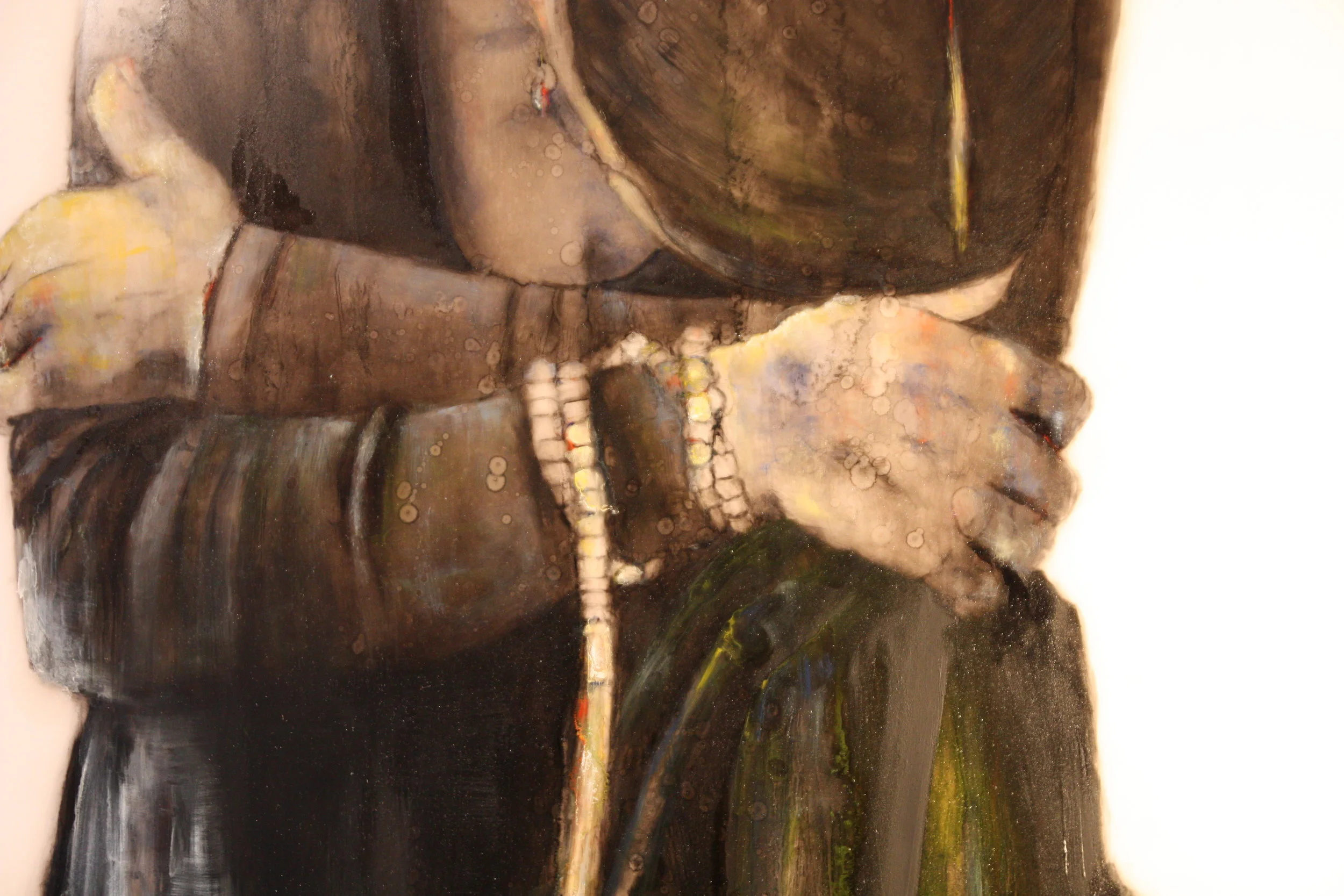In collaboration with video artist Cliff Caines and audio artist Darren Copeland, this dramatic tableau was created. Life-sized figurative self-portraits were depicted through a series of oil paintings on large sheets of semi translucent mylar, illustrating many painful poses and settings of grief. The artist wanted to portray the delicate yet powerful world of an Iranian woman confined in the unfair atmosphere she inhabits. Video projections and music both animated and extended the images into a temporal and internal domain – even using the sounds of the artist’s internal blood flow. This work reveals a personal yet universal dialogue of womanhood through iconic imagery.